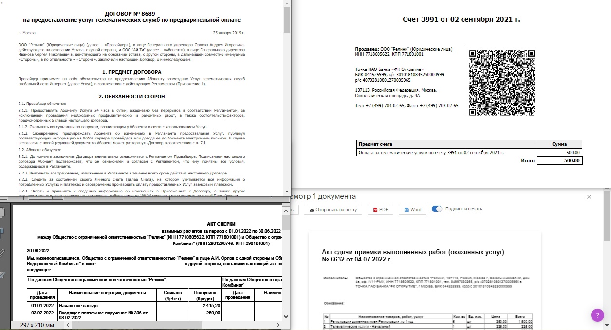 Предварительные варианты документов можно просмотреть в соответсвующих разделах биллинговой системы: Договоры, Платежи, Акты выполненных работ.