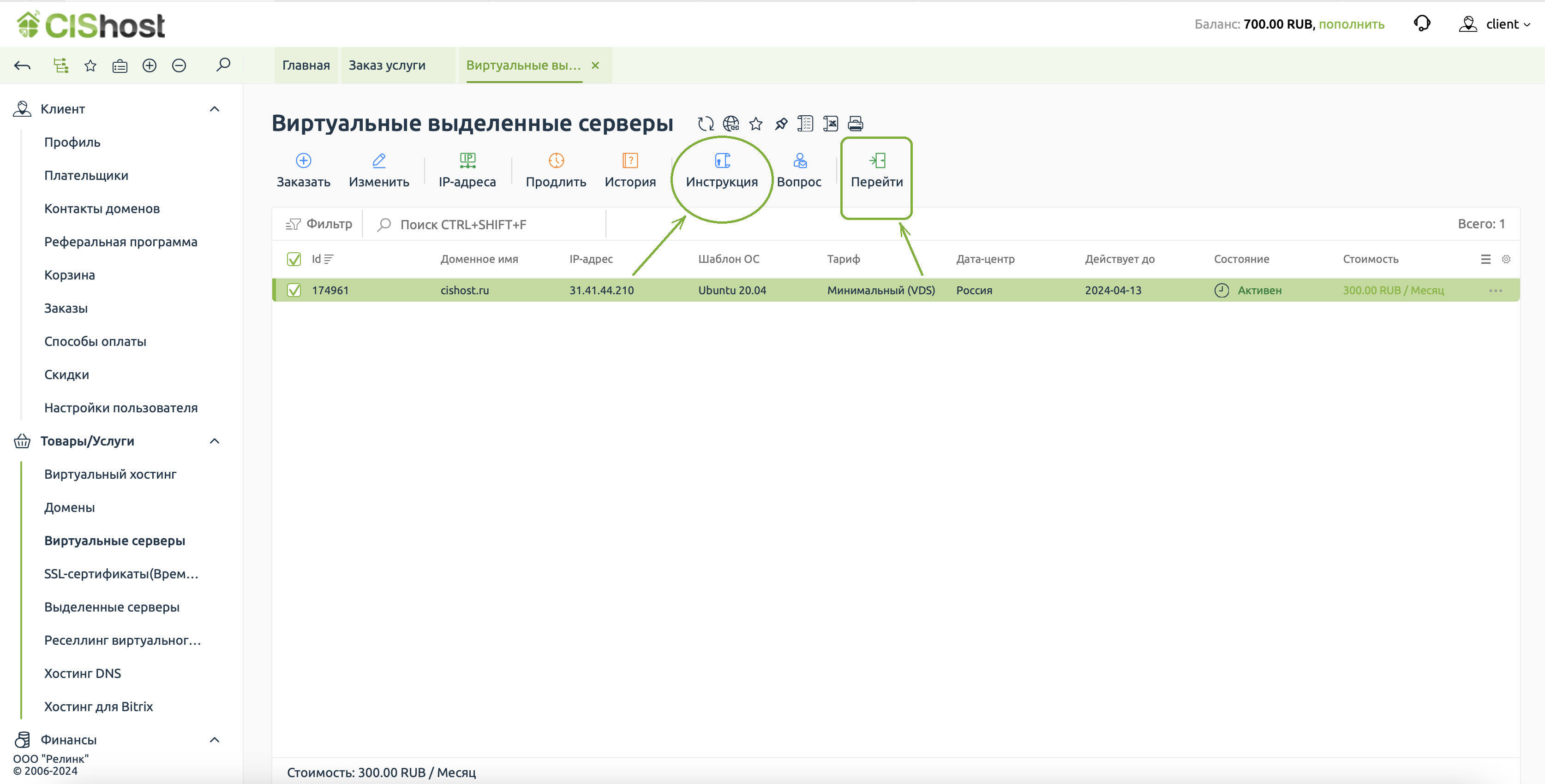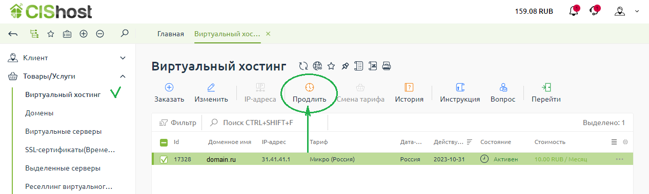 1. В биллинговой системе в блоке "Товары/Услуги" выбираем раздел с услугой, для которой требуется выполнить продление, например "Вируальный хостинг", затем кликаем по строке с активной услугой и нажимаем кнопку "Продлить"