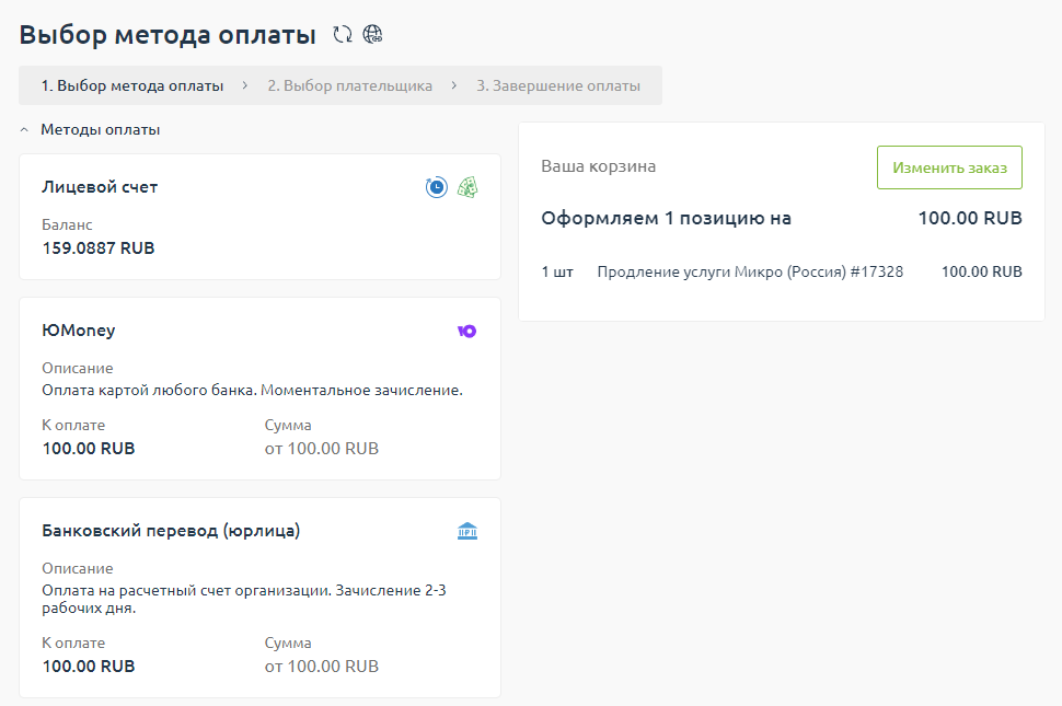 4. Выбираем способ оплаты : лицевой счет, ЮMoney, банковский перевод