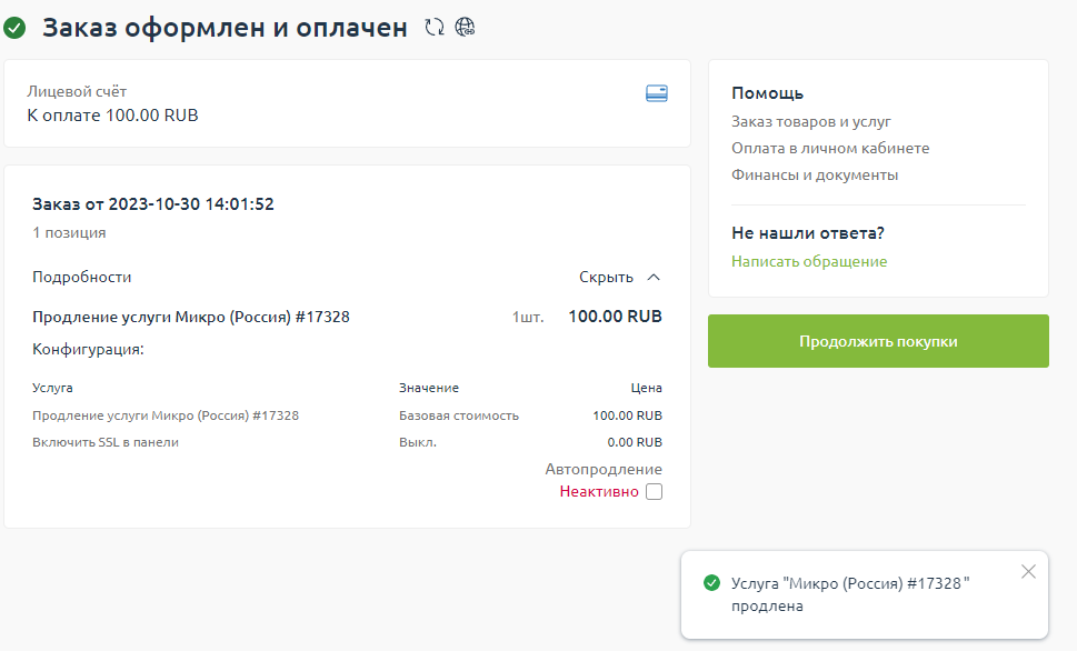 6. Получаем подтверждение об оплате и продлении услуги