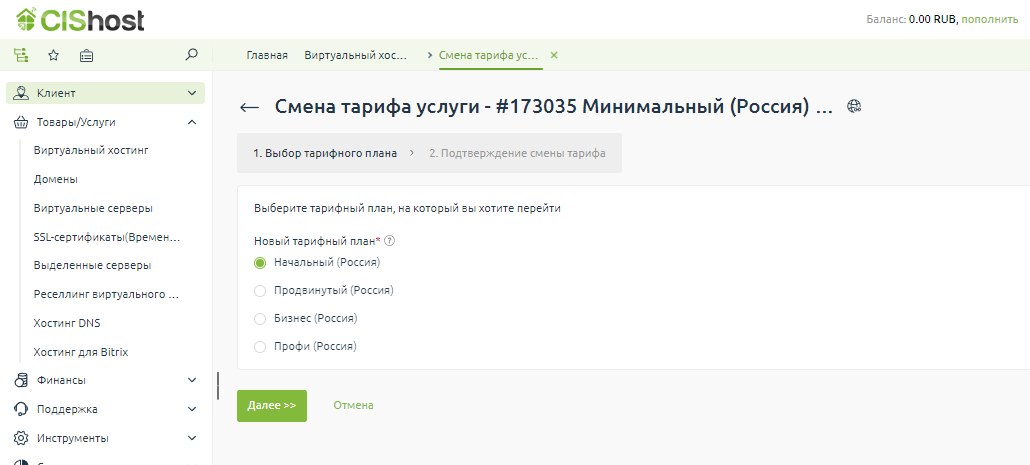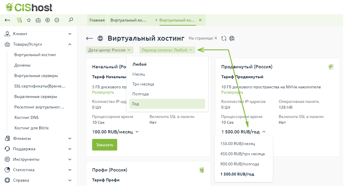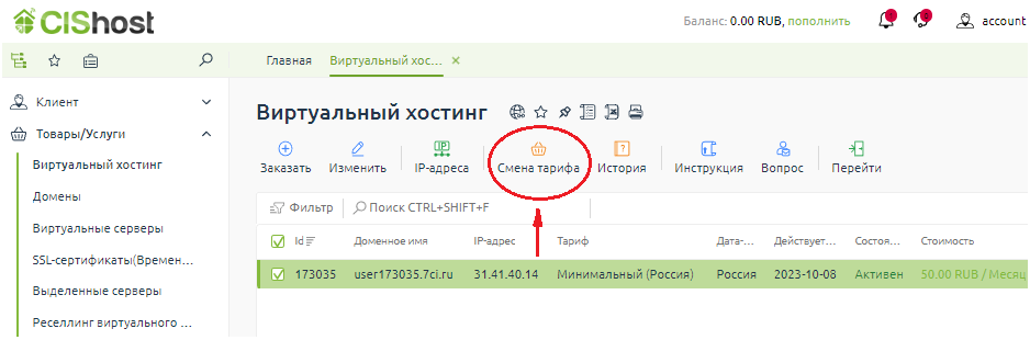 1. В биллинговой системе в блоке "Товары/Услуги" выбираем раздел "Вируальный хостинг", затем кликаем по строке с активной услугой и нажимаем кнопку "Смена тарифа"