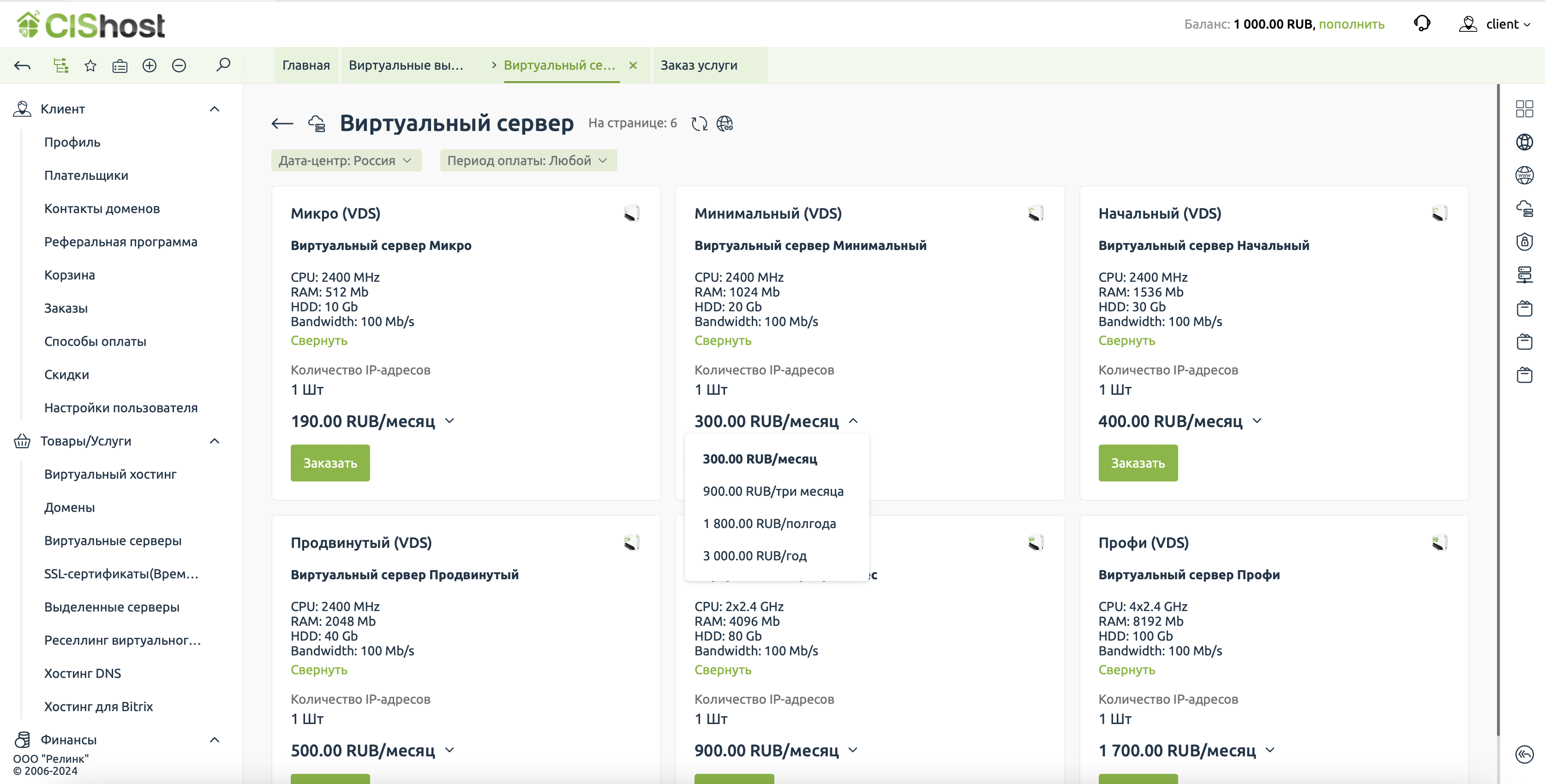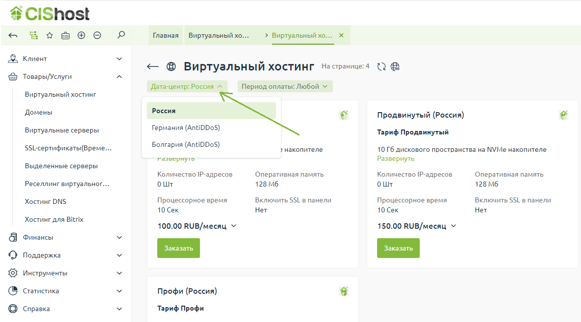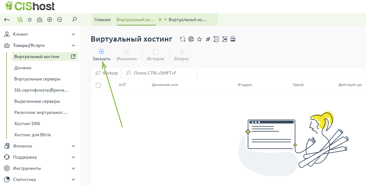 На вкладке "Виртуальный хостинг" нажмите кнопку "Заказать"