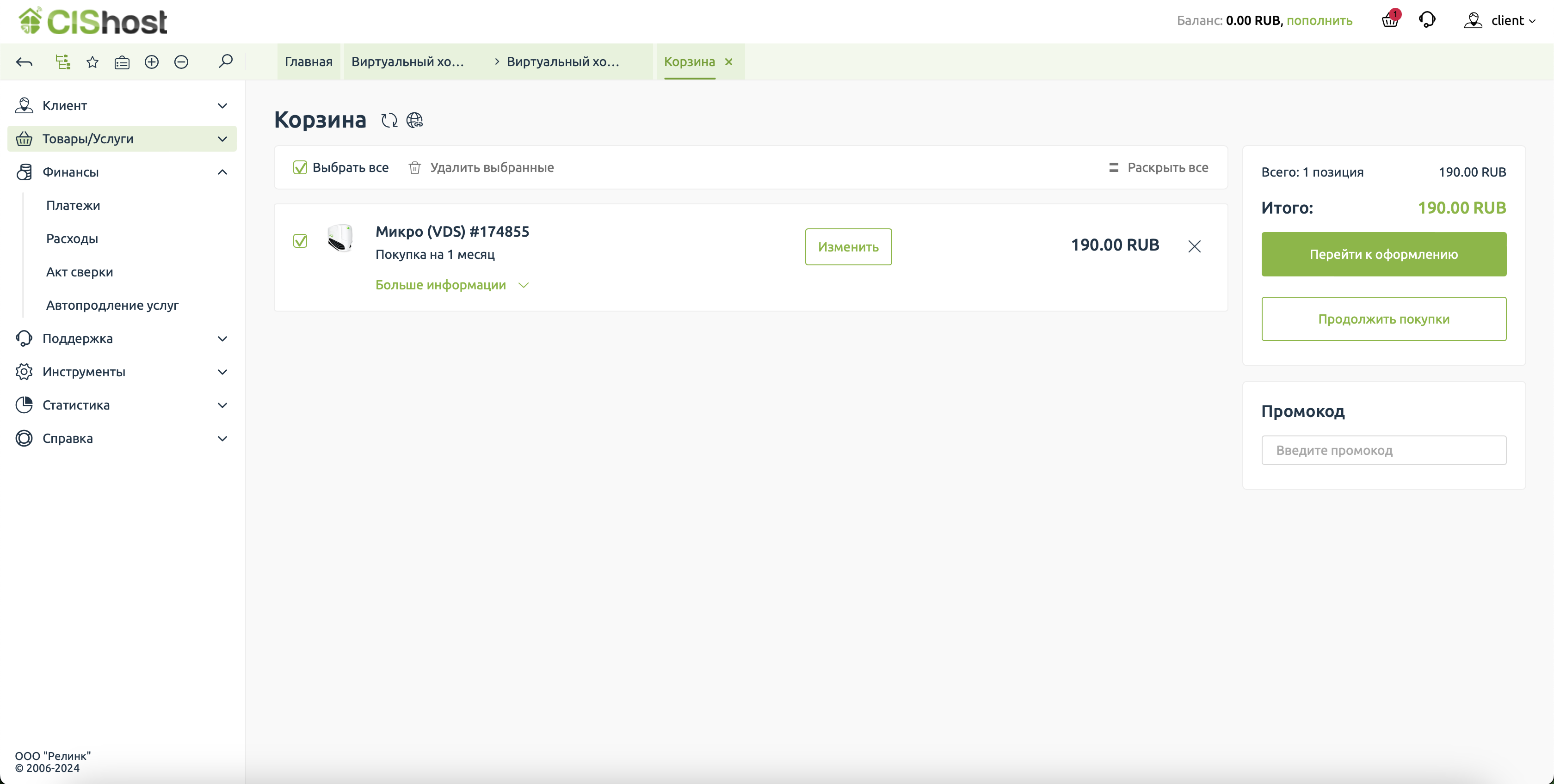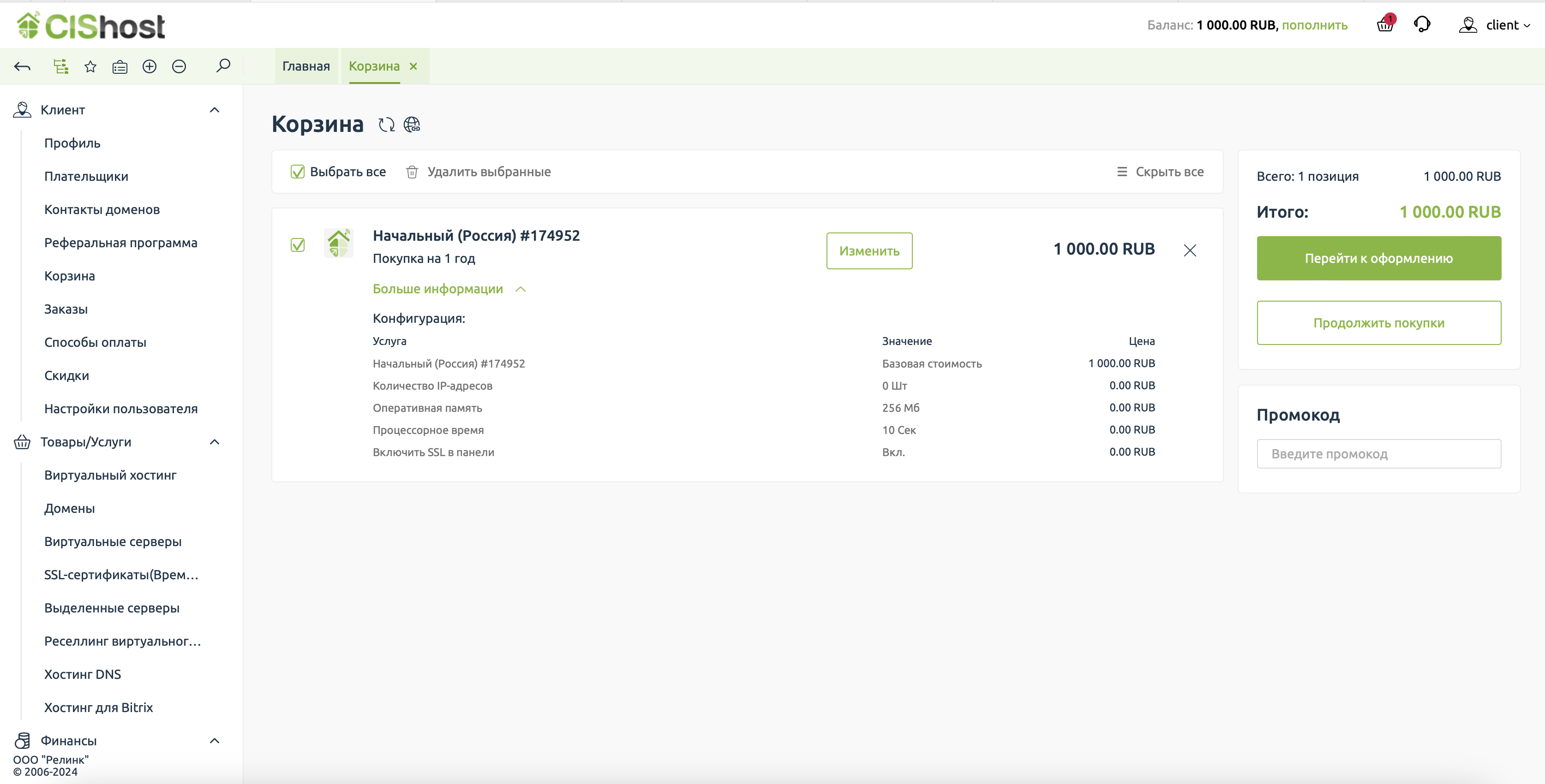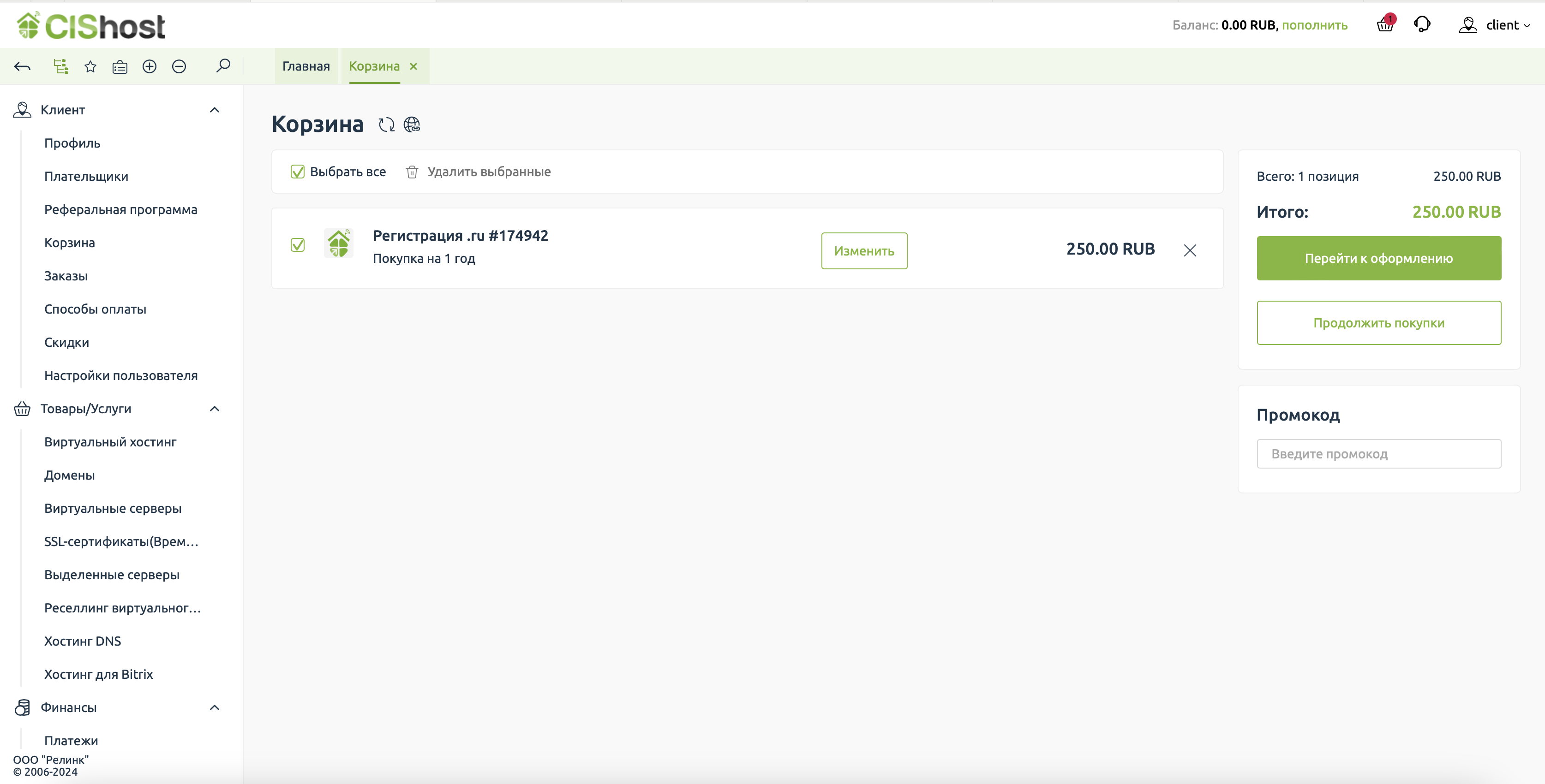 Домен в корзине, почти закончили. Переходим к оформлению счёта на оплату.
