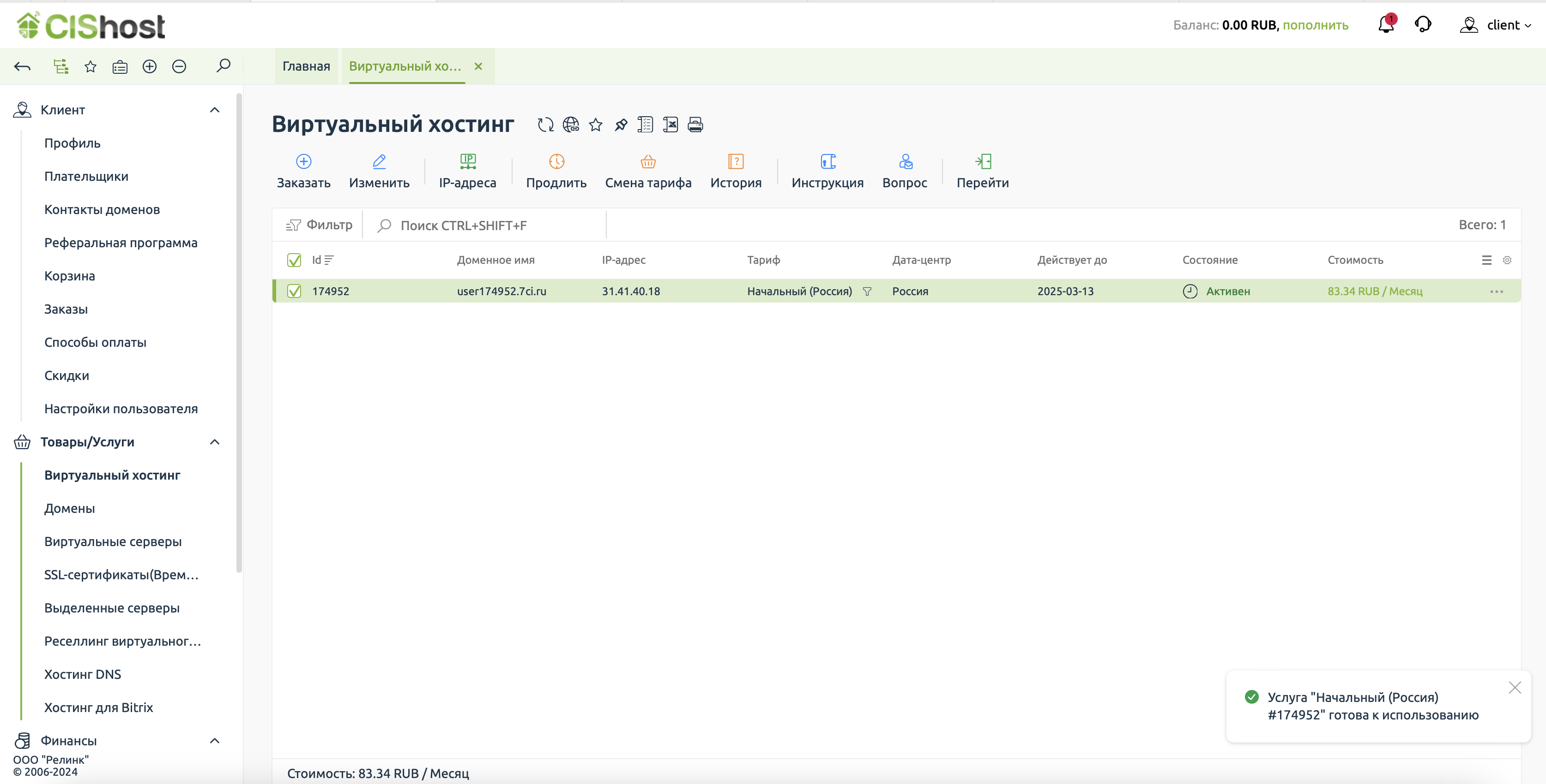 Услуга хостинга активна!