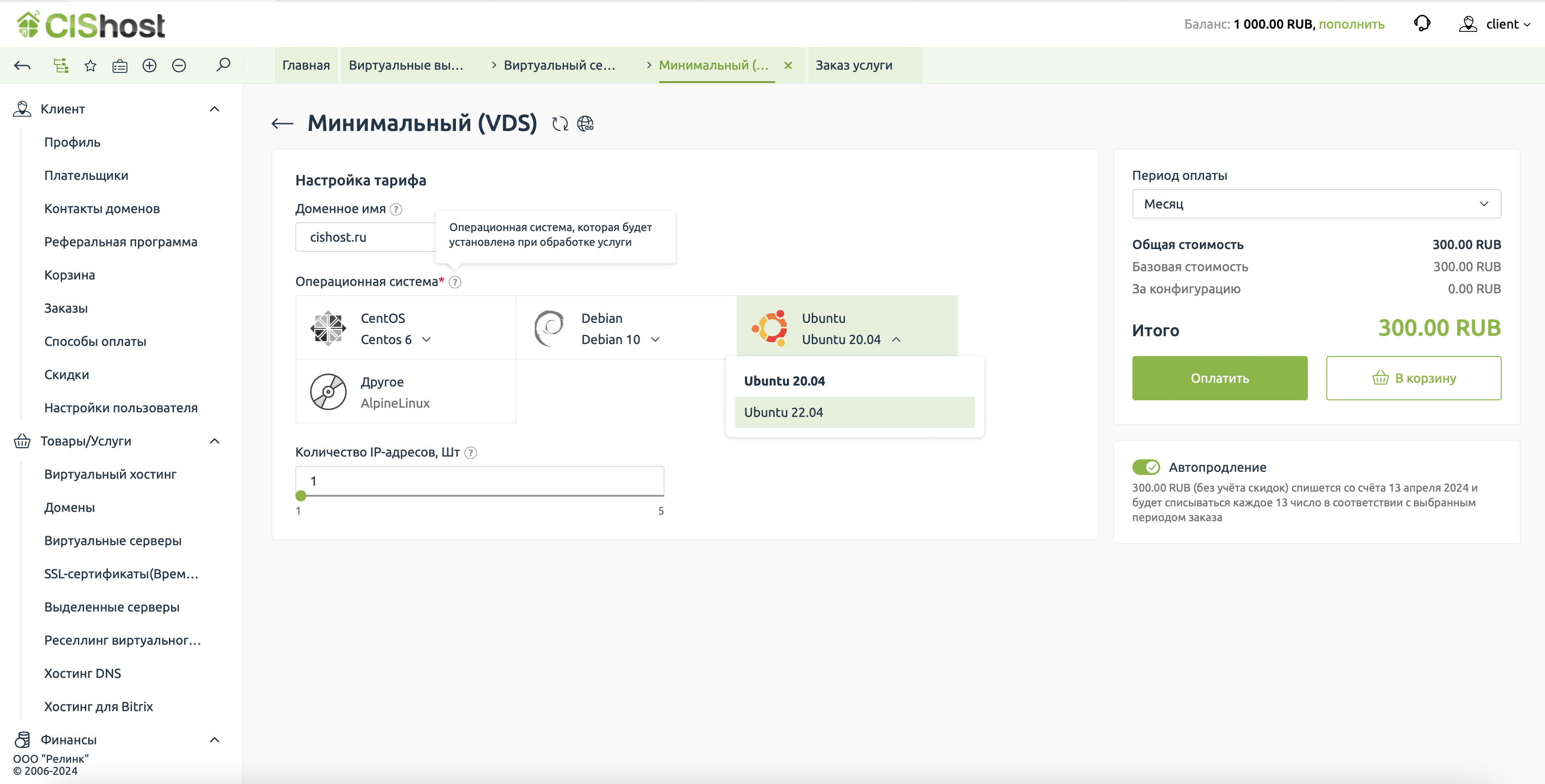 Опционально можно добавить оперативную память, процессорное время и меню подключения SSL сертификатов в панели