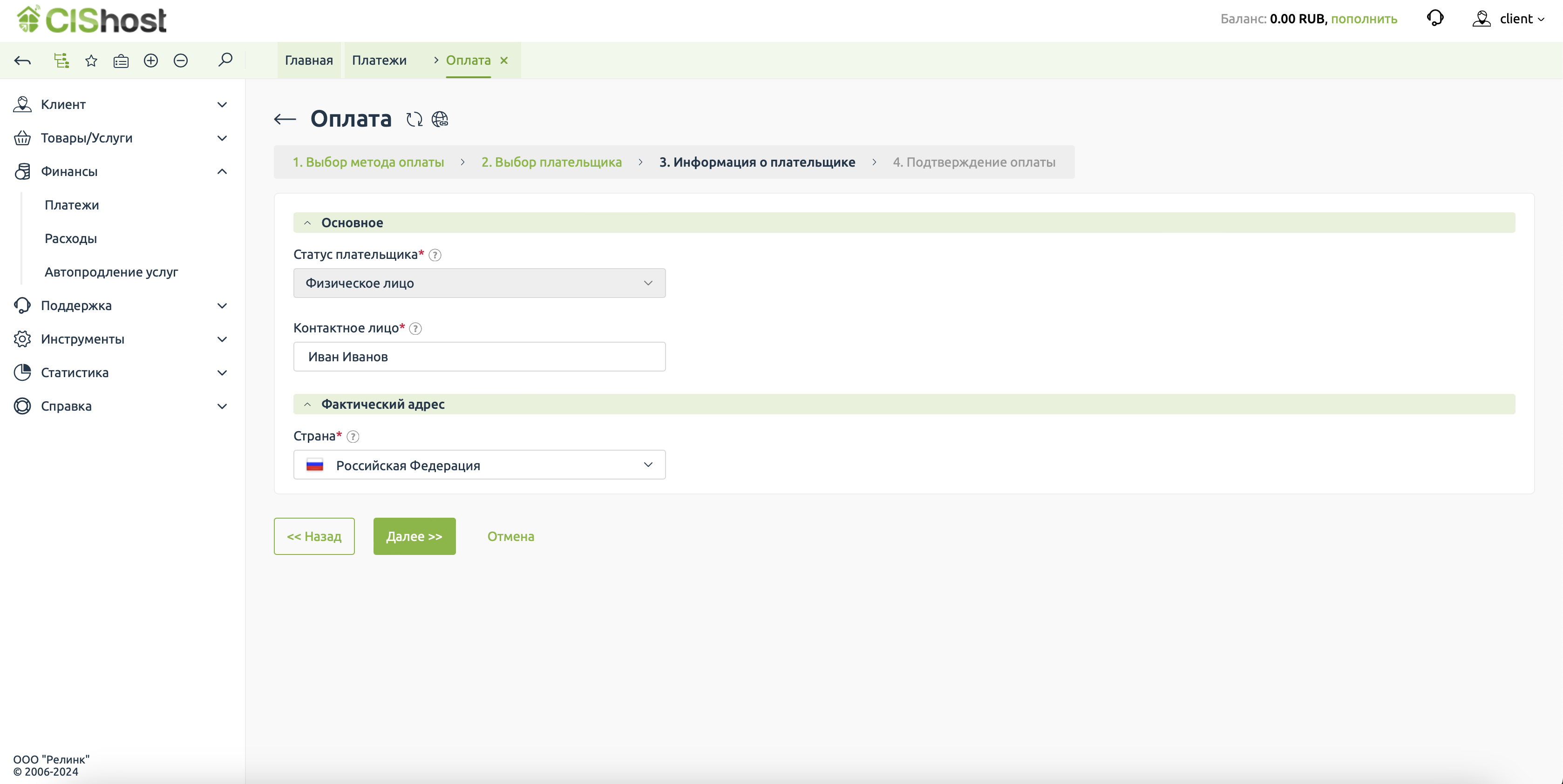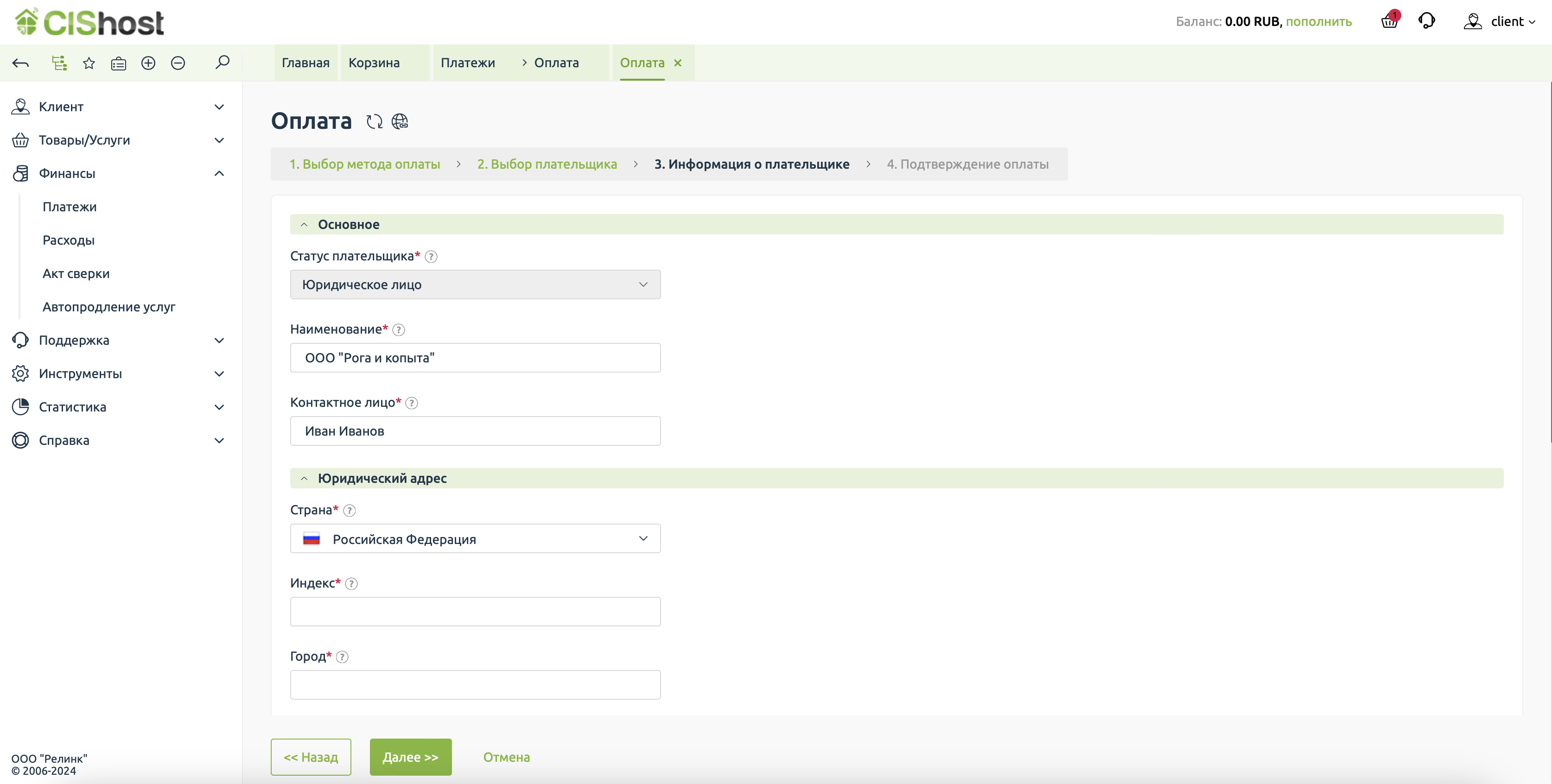 В примере мы выбираем юридическое лицо и заполняем всё необходимое. В дальнейшем эти данные всегда можно актуализировать в разделе Плательщики.