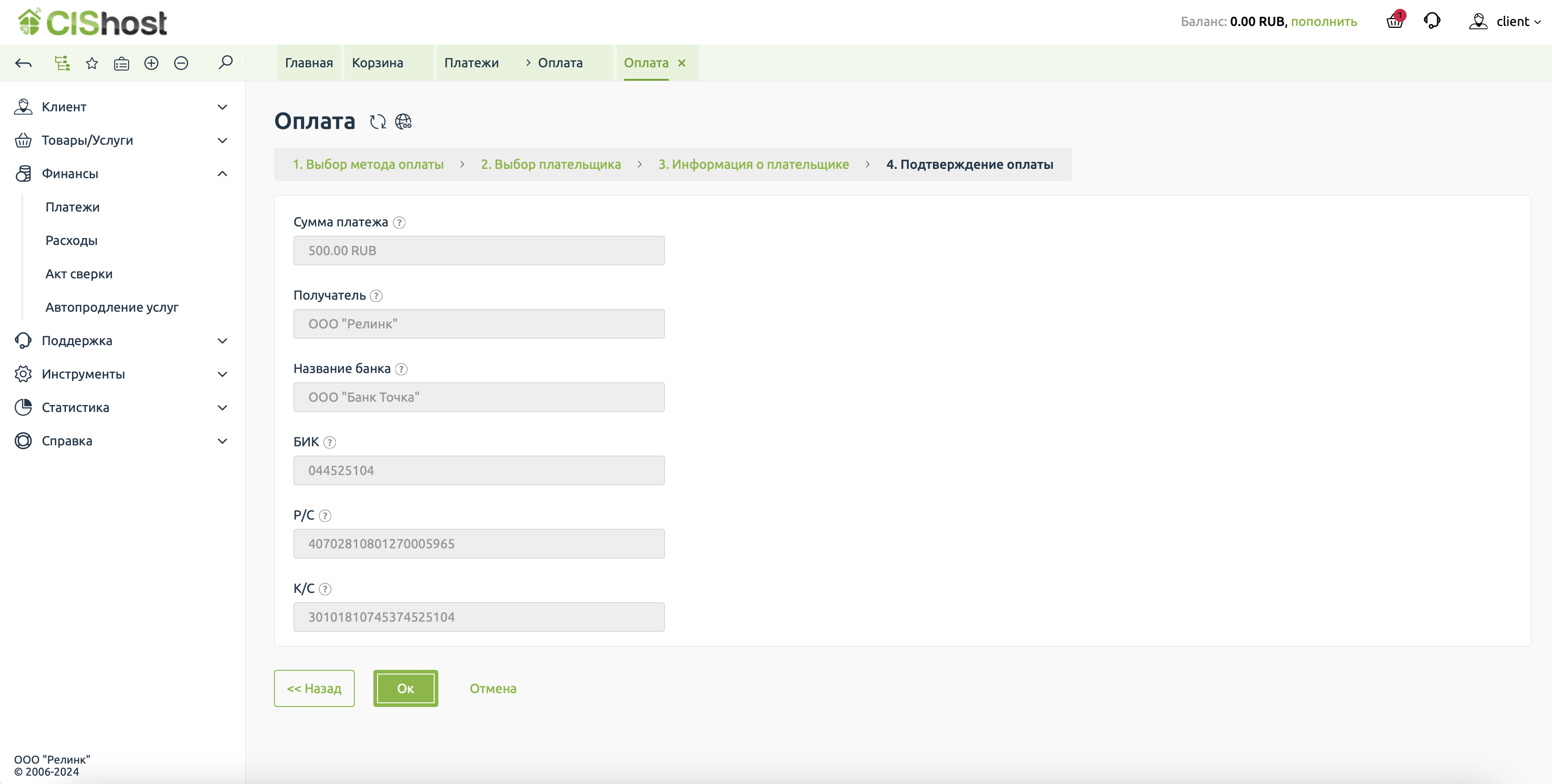 Почти всё готово. Мы видим сумму платежа и данные организации, на счет которой нужно произвести оплату.