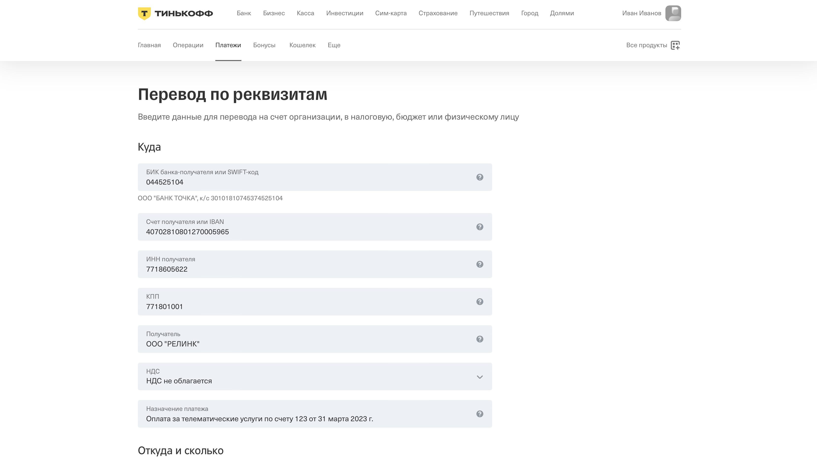 Пример заполнения через онлайн банк: