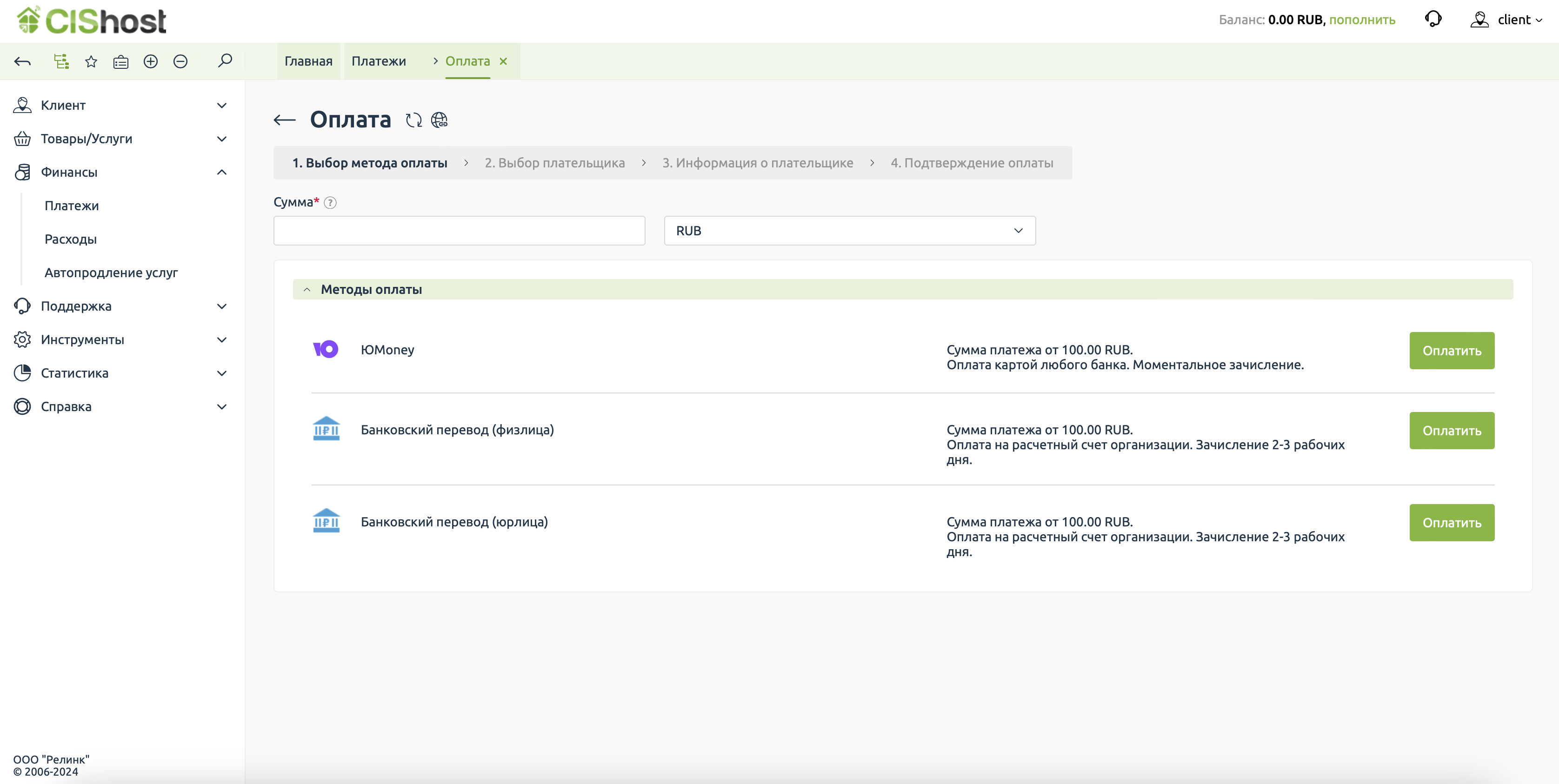 На этом шаге выбираем метод оплаты Банковский перевод, счёт можно будет оплатить от физического или от юридического лица. Нужное нужно сразу выбрать на странице, от этого будет зависеть тип плательщика на следующем этапе. Минимальный платёж через банк - 100 рублей.