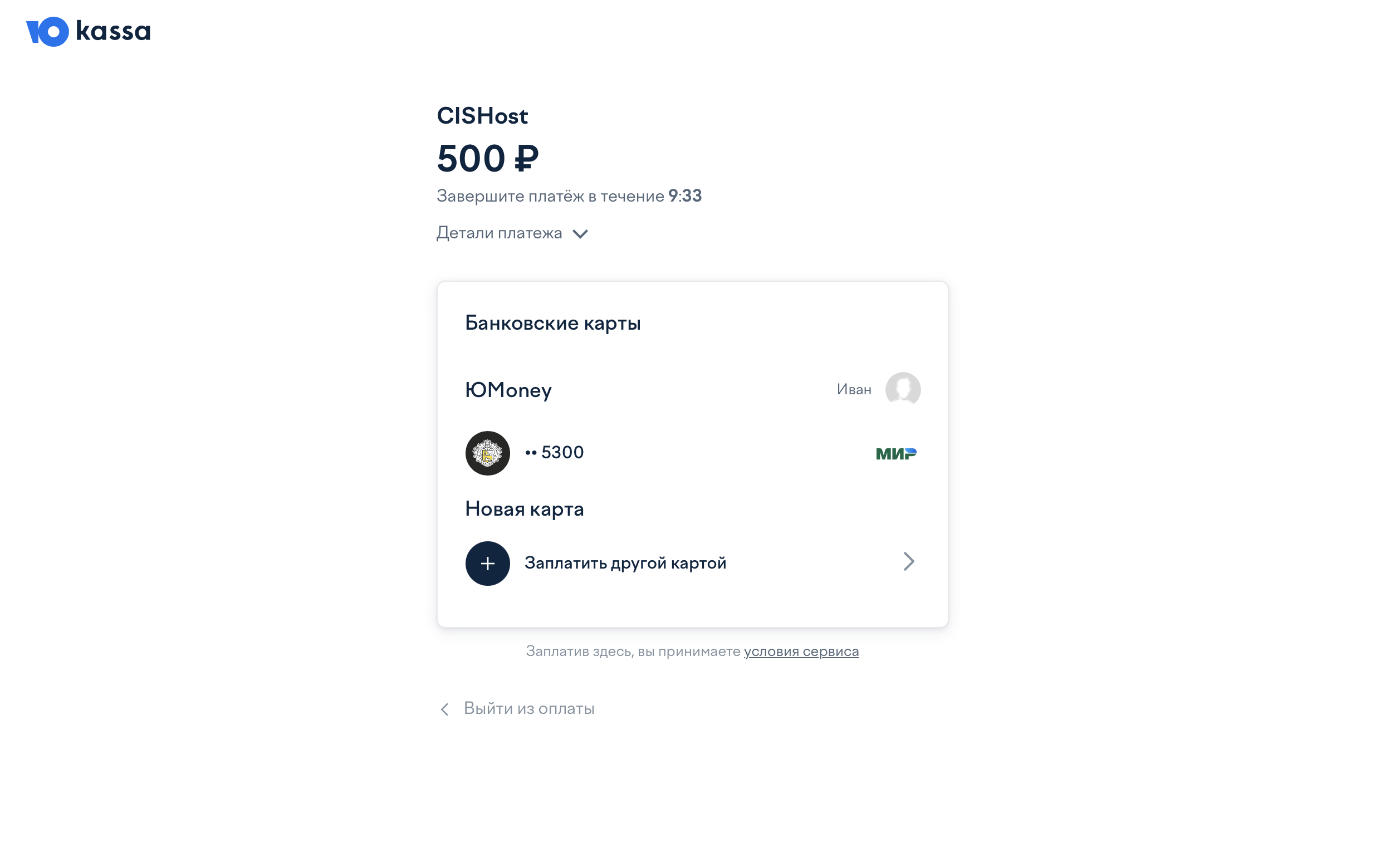 На этом шаге выбираем метод оплаты Юmoney, счёт можно будет оплатить картой любого российского банка. Минимальный платёж - 100 рублей.