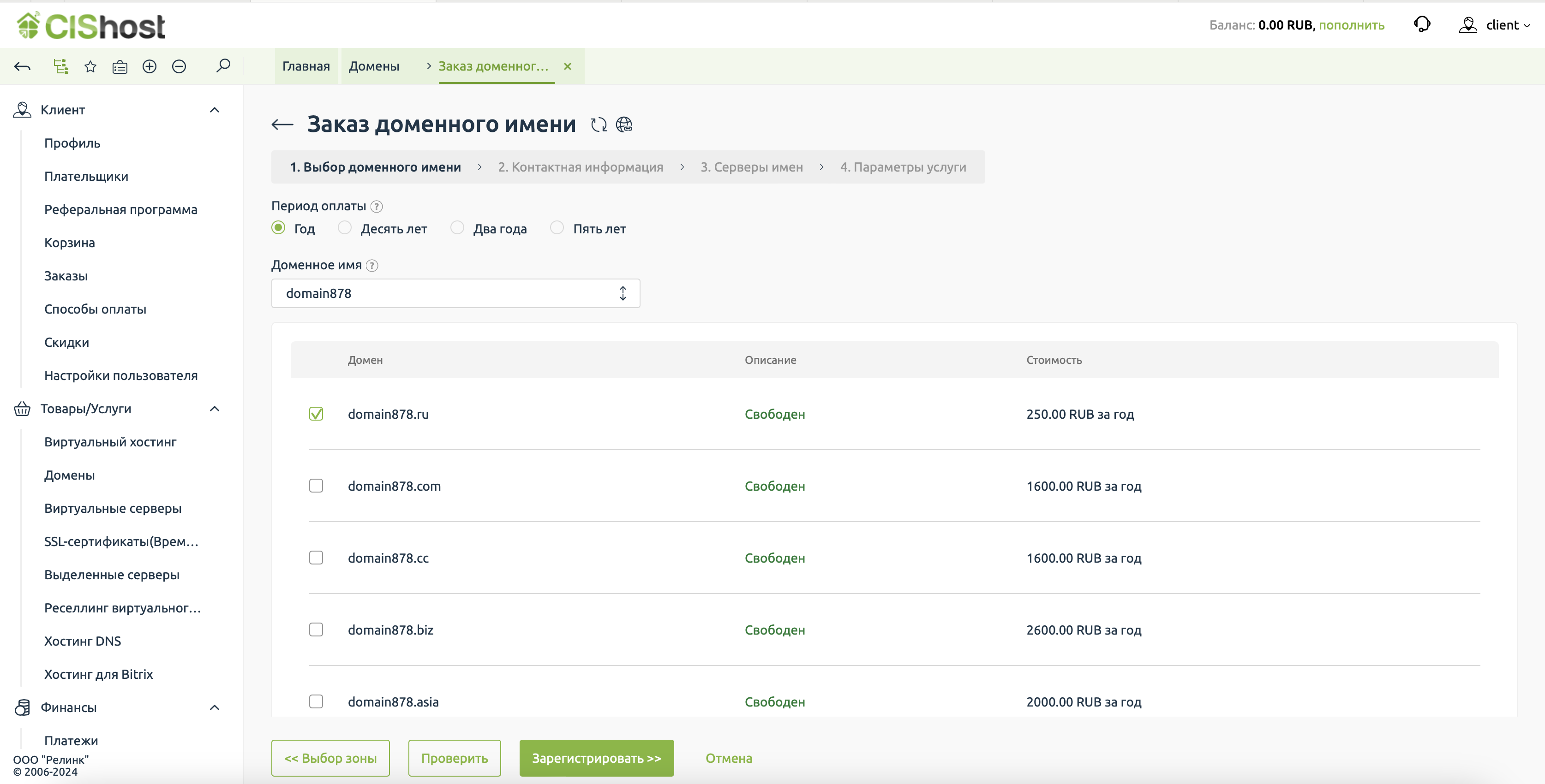 Если искомый домен в нужной зоне свободен, выбираем его и нажимаем "Зарегистрировать".