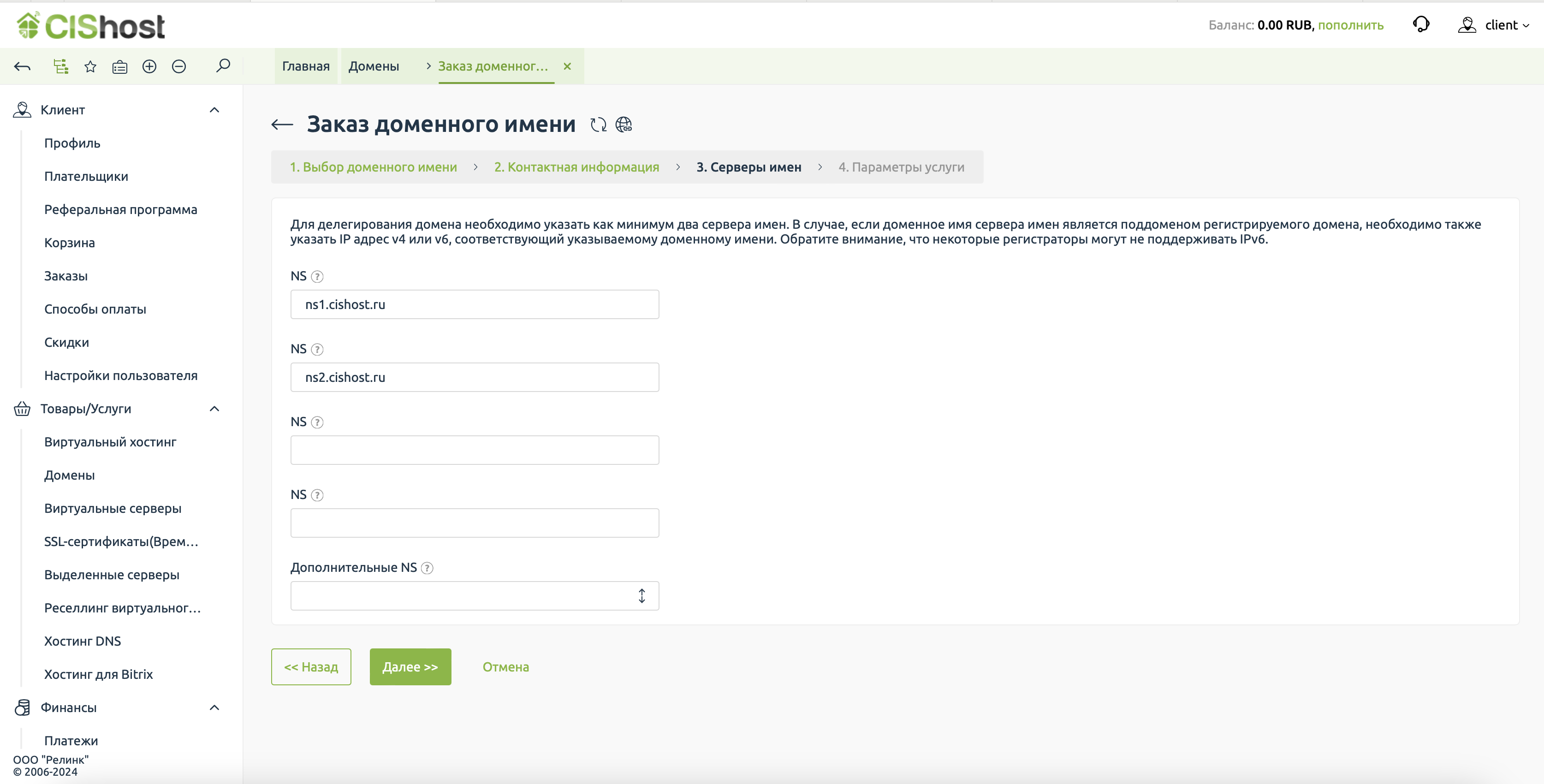 Указываем серверы имён. DNS серверы CISHost: ns1.cishost.ru и ns2.cishost.ru.