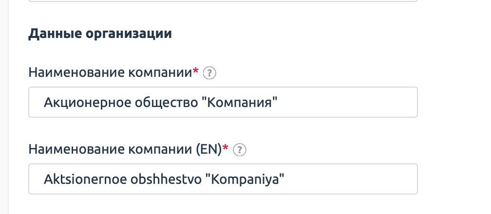 Наименование компании необходимо указывать без сокращений: Акционерное общество "Компания" (Ru); Aktsionernoe obshhestvo "Kompaniya" (En)
