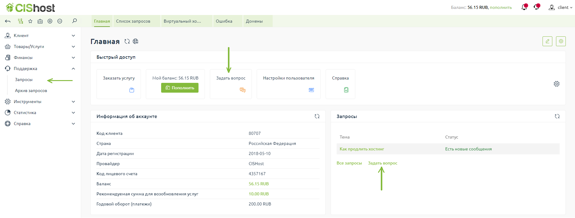 1) по кнопке "Задать вопрос" из меню "Быстрого доступа", либо через виджет "Запросы" на главной странице биллинговой системы