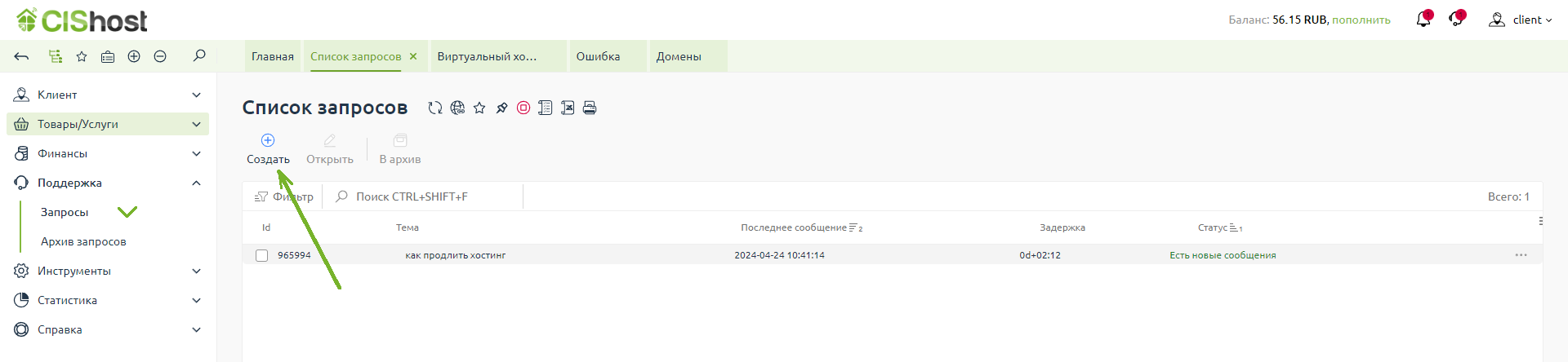 2) Через блок "Поддержка" меню "Запросы" нажать на кнопку "Создать"
