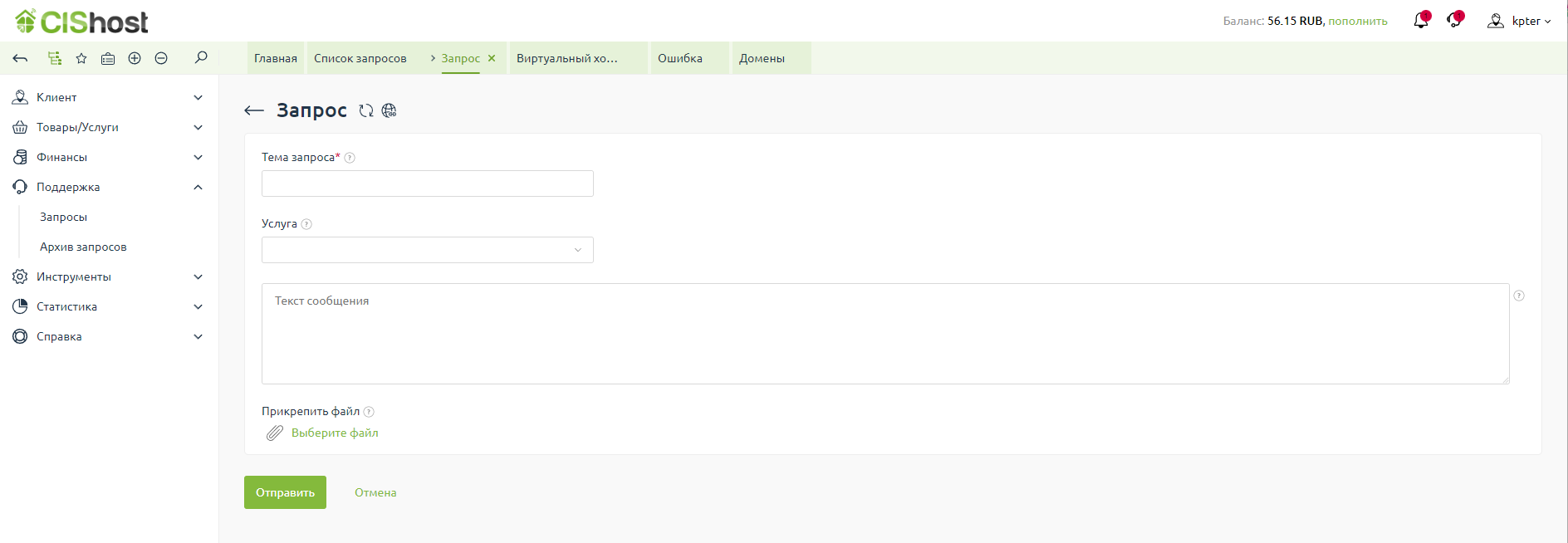 Указываете тему запроса, выбираете услугу, к которой относится вопрос, описываете суть вопроса, для наглядности можно приложить скриншоты с ошибками.
