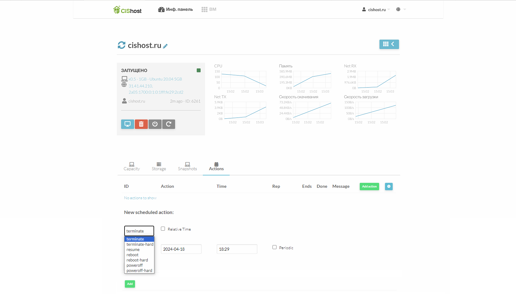 В панели можно выполнить перезагрузку, переустановку VDS, подключиться с помощью VNC клиента, доступен планировщик.