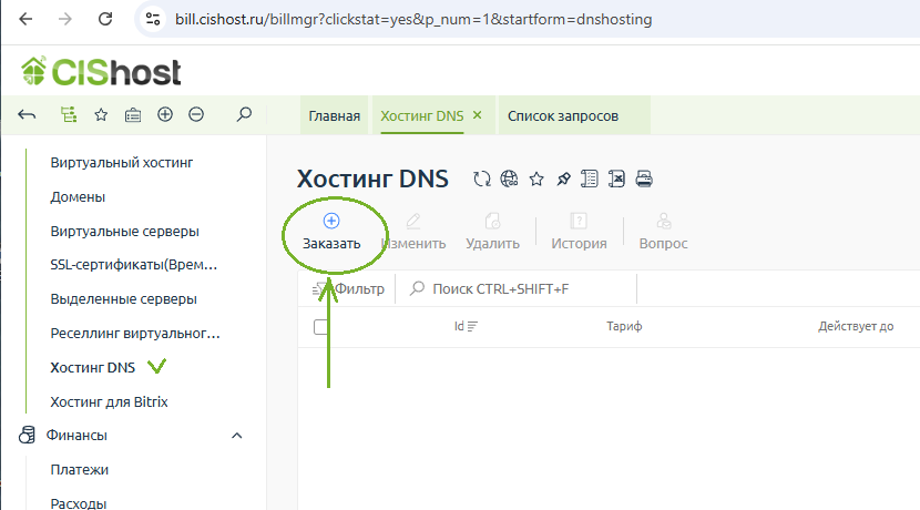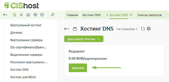 Далее заказываем услугу хостинга DNS. Для заказа услуги в биллинговой системе в разделе "Хостинг DNS" нажимаем кнопку "Заказать"