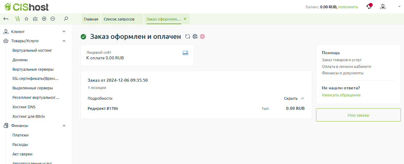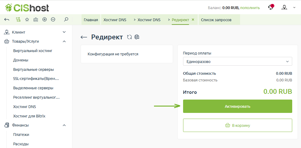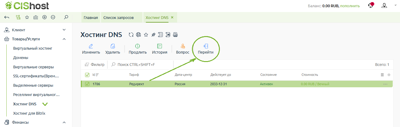 Переходим в панель управления заказанной услуги, для этого кликаем по строке с услугой и нажимаем кнопку "Перейти"