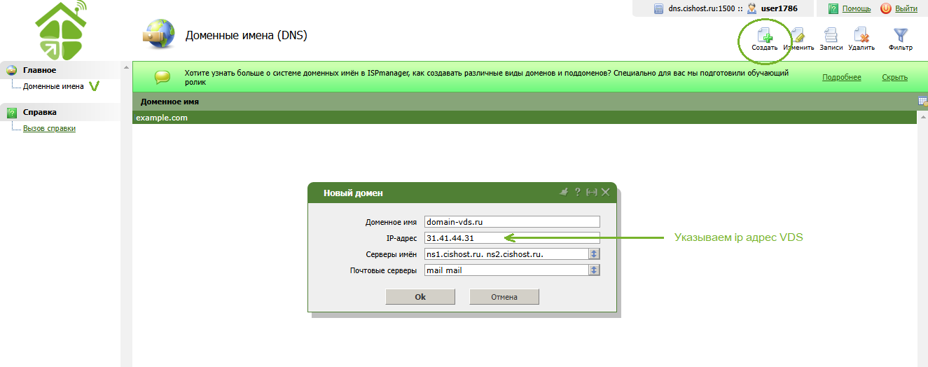 Добавляем домен, указывая ip адрес VDS сервера или хостинга, на котором он будет размещен