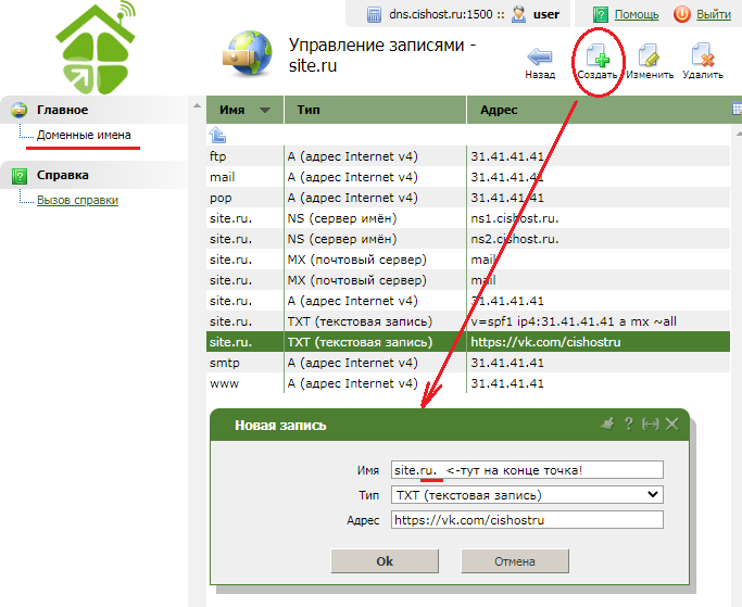 Если требуется установить редирект на страничку в социальной сети или на другой сайт в интернете, тогда дважды кликаем по добавленному домену, откроются записи, в управлении записями создадим новую TXT запись с желаемой ссылкой редиректа.