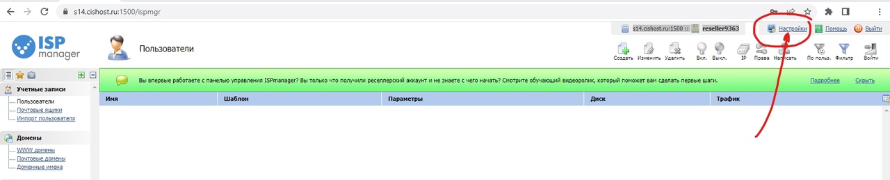 В "Настройках" ISPmanager (реселлер) можно посмотреть логин и задать пароль.
