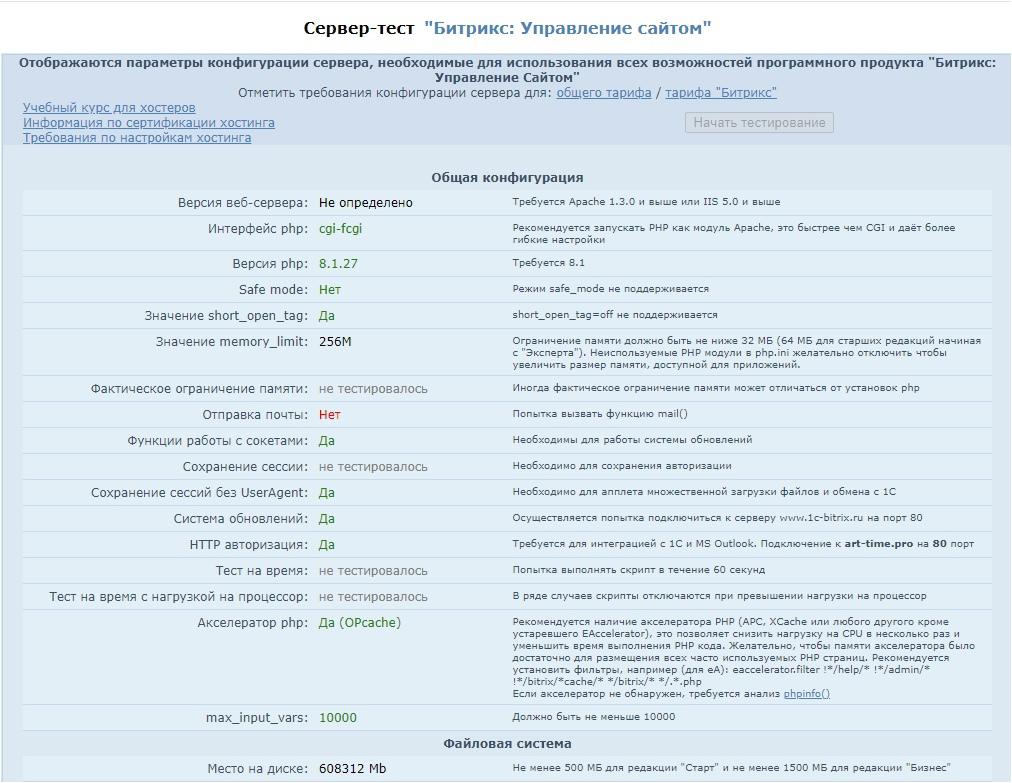 Для проверки параметров сервера скачиваем скрипт bitrix_server_test от компании "1С-Битрикс" и заливаем в корневой каталог сайта /www/сайт.ru . После перехода на https://сайт.ru/bitrix_server_test.php будет выполнено тестирование конфигурации сервера на соответсвие требований к функционированию CMS.