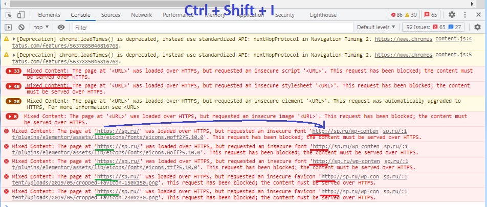 После подключения сертификата при переходе на сайт по протоколу https могут возникнуть ошибки Mixed Content (смешанное содержимое)