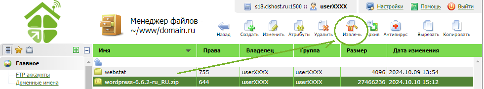 Панель управления - Менеджер файлов - кликаете по архиву - канопка "Извлечь"