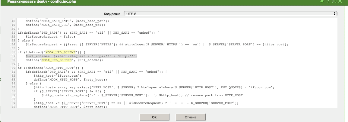 2) Открываем файл конфигурации /www/sitename.ru/core/config/config.inc.php