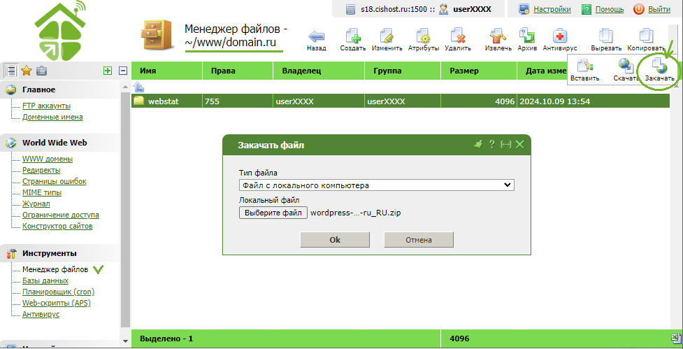- по FTP: Инструкция по работе с FTP: https://wiki.cishost.ru/index.php/Работаем_с_FTP