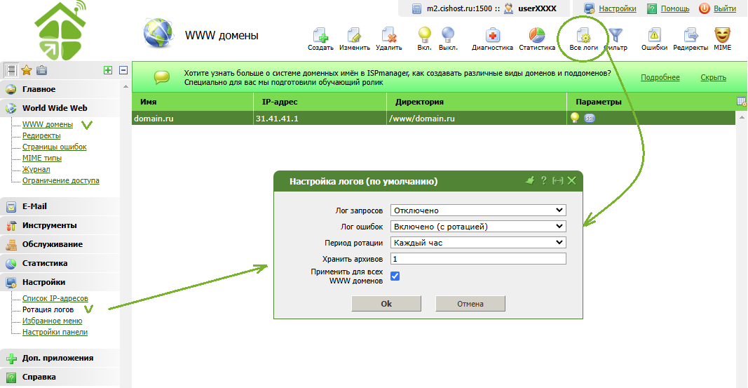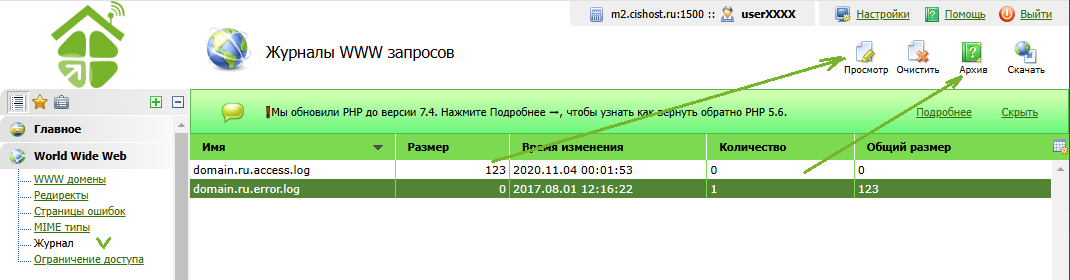 Панель управления - www-домены - кнопка "Все логи"